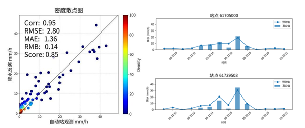 2025年5月22日,陸水流域遭遇今年入汛以來最強降雨,全流域普降暴雨至大暴雨,日面雨量達101毫米,最大小時累積降水量超過40毫米。陸水流域測雨雷達系統表現良好,運行穩定。經過全過程檢驗,小時累積降水量均方根誤差2.8毫米、平均相對誤差14%。提前3小時預報強降雨中心區域及量級,并精準研判本輪降雨過程將在5月22日20時結束,為防汛決策爭取寶貴時間窗口。